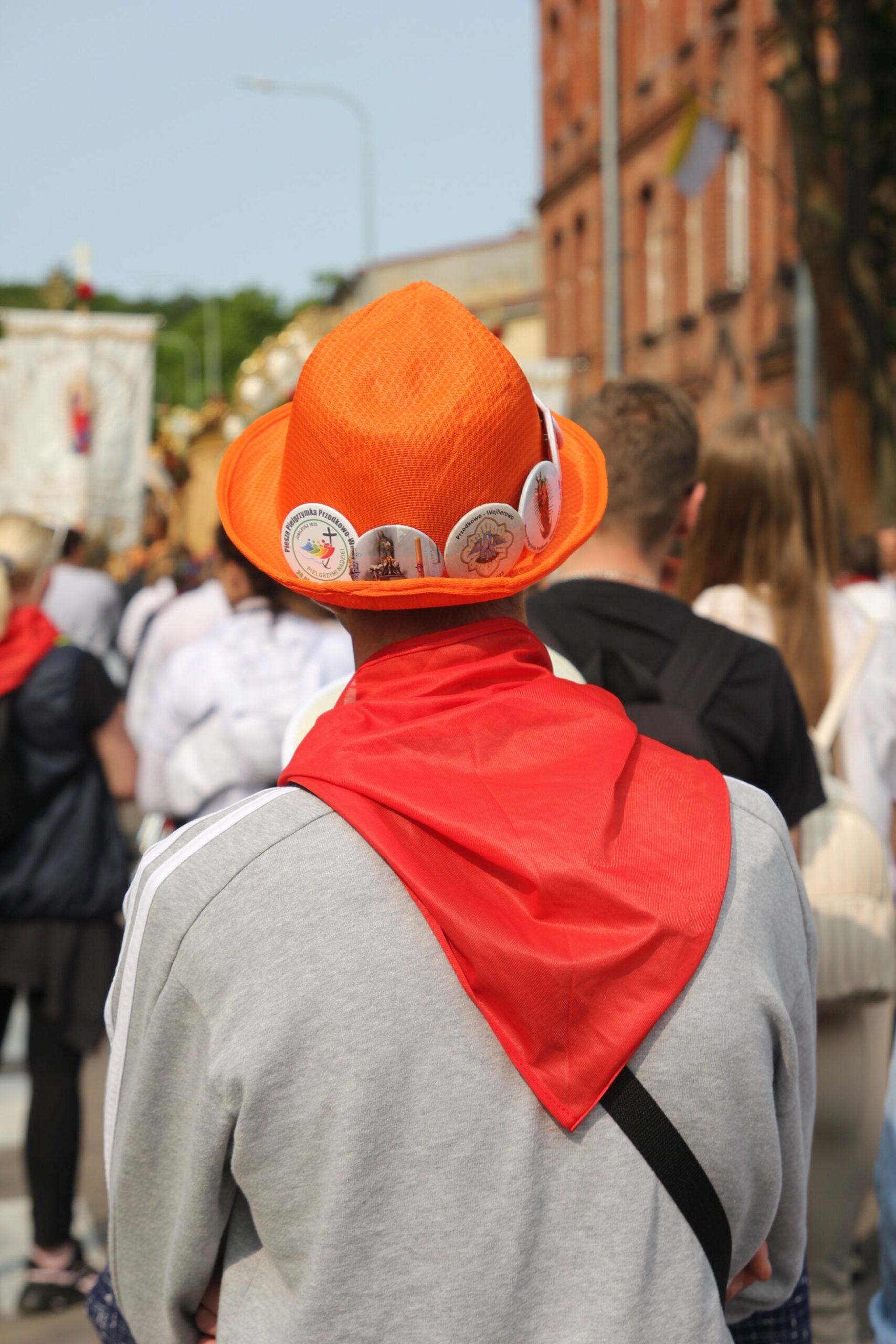 Uczestnik pielgrzymki z Przodkowa z przypinkami na kapeluszu Uczestniczka pielgrzymki z Przodkowa w samodzielnie zaaranżowanym kapeluszu z motywami kolorowego haftu kaszubskiego